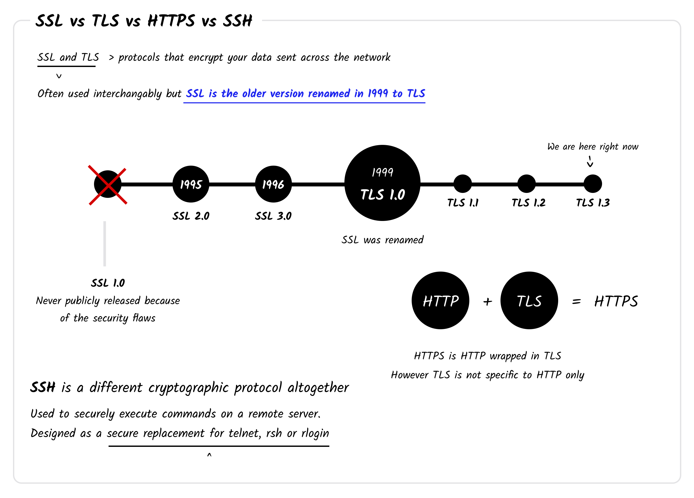 SSL 與 TLS 都是將網路傳輸內容加密的通訊協定,兩者時常被交替使用表達加密這件事,但精準來說 SSL 已經在 1999 年被重新命名為 TLS,一般提到 SSL 都是表示 TLS。被 TLS 包裝的 HTTP 即為 HTTPS,但 TLS 並不僅侷限用於 HTTP 上。