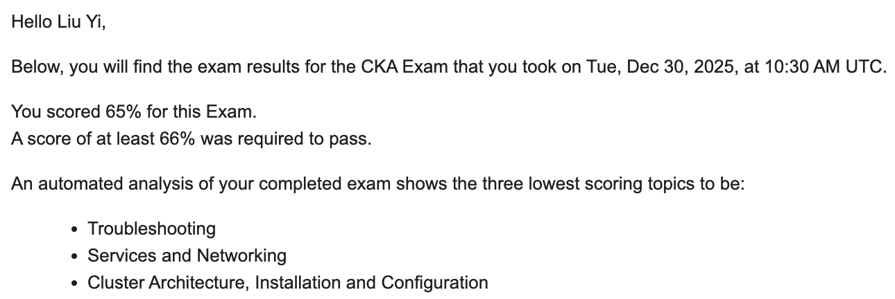 有了兩次 CKA 的考試經驗,加上充足的練習,考試的心情就有比較穩定,不過也還是兩個小時寫好寫滿,沒有太多多餘的時間進行檢查。最後是 88 分通過,考試結果通知也是在完成考試約 24 小時後收到。
